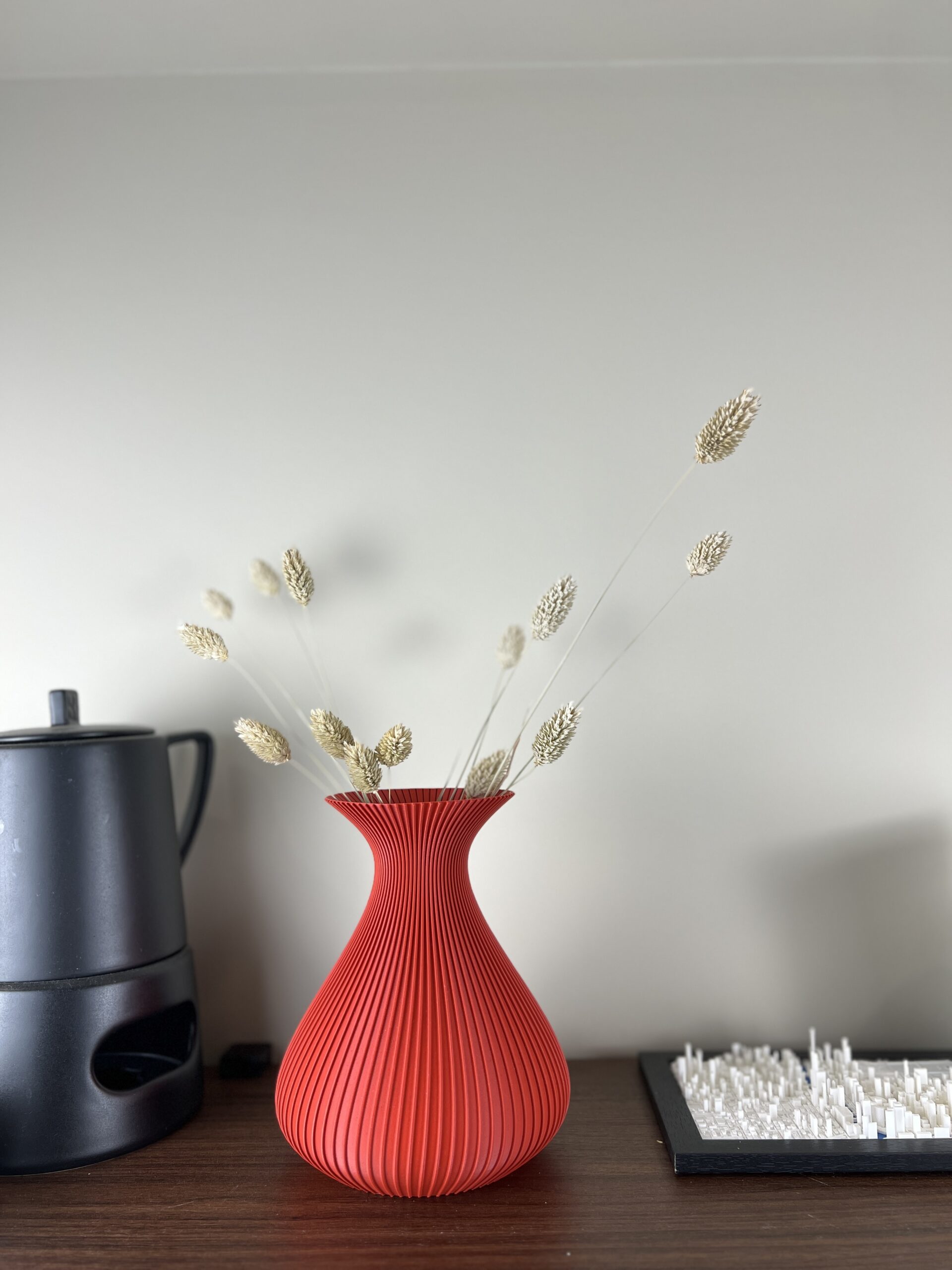 - Doordat de vaas middels 3D-printtechnieken geproduceerd wordt, kunnen er minimale onregelmatigheden aan het oppervlak zichtbaar zijn